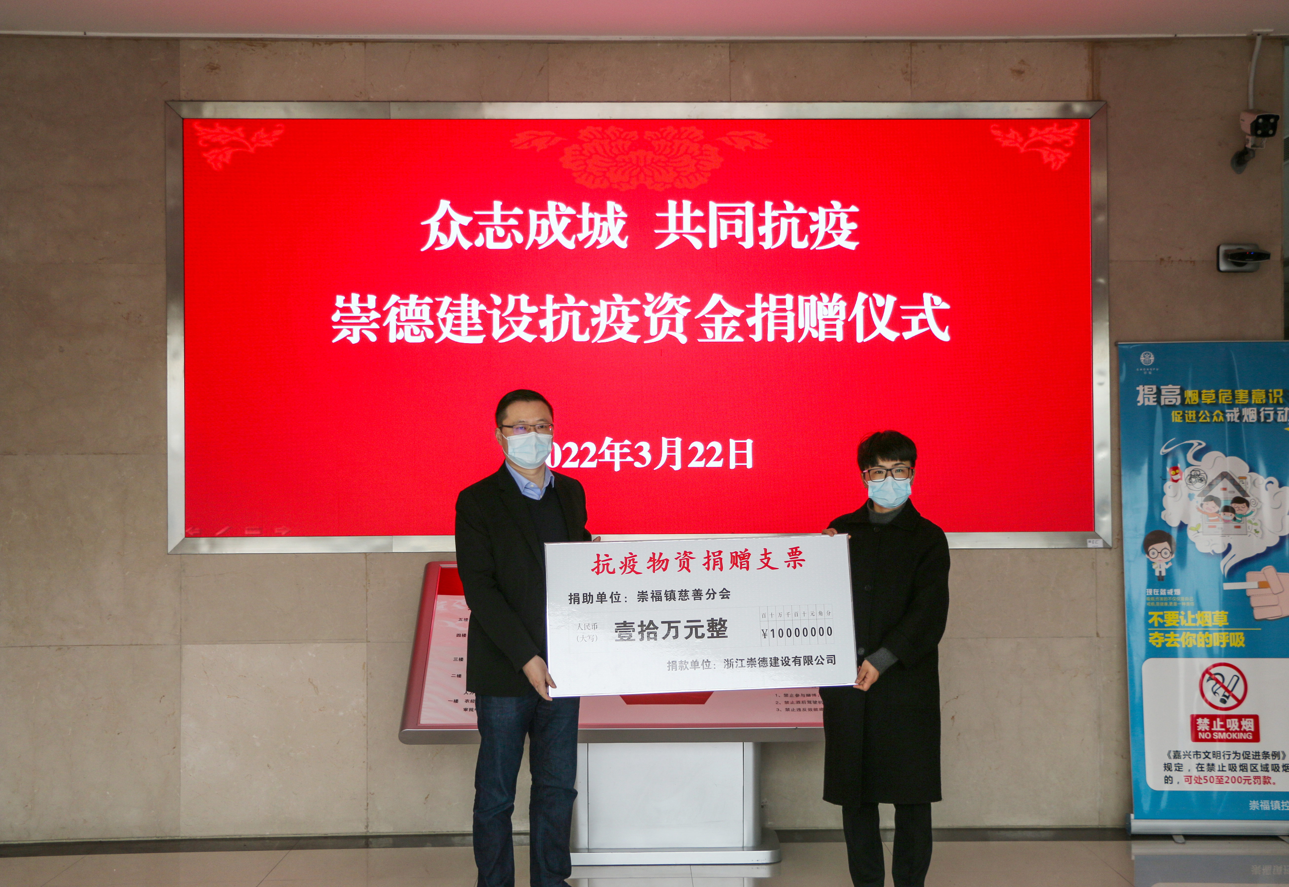 共戰(zhàn)疫情,有你有我。2022年3月22日,浙江崇德建設(shè)有限公司抗疫資金捐贈儀式在崇福鎮(zhèn)鎮(zhèn)政府大廳內(nèi)舉行。桐鄉(xiāng)市慈善總會會長沈濟賢、崇福鎮(zhèn)黨委副書記沈亞平、浙江崇德建設(shè)有限公司董事長郁振華等出席。